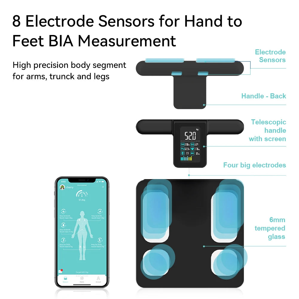 8-electrode scale uses a segmented bio-resistance impedance measurement to measure the limbs and trunk directly.